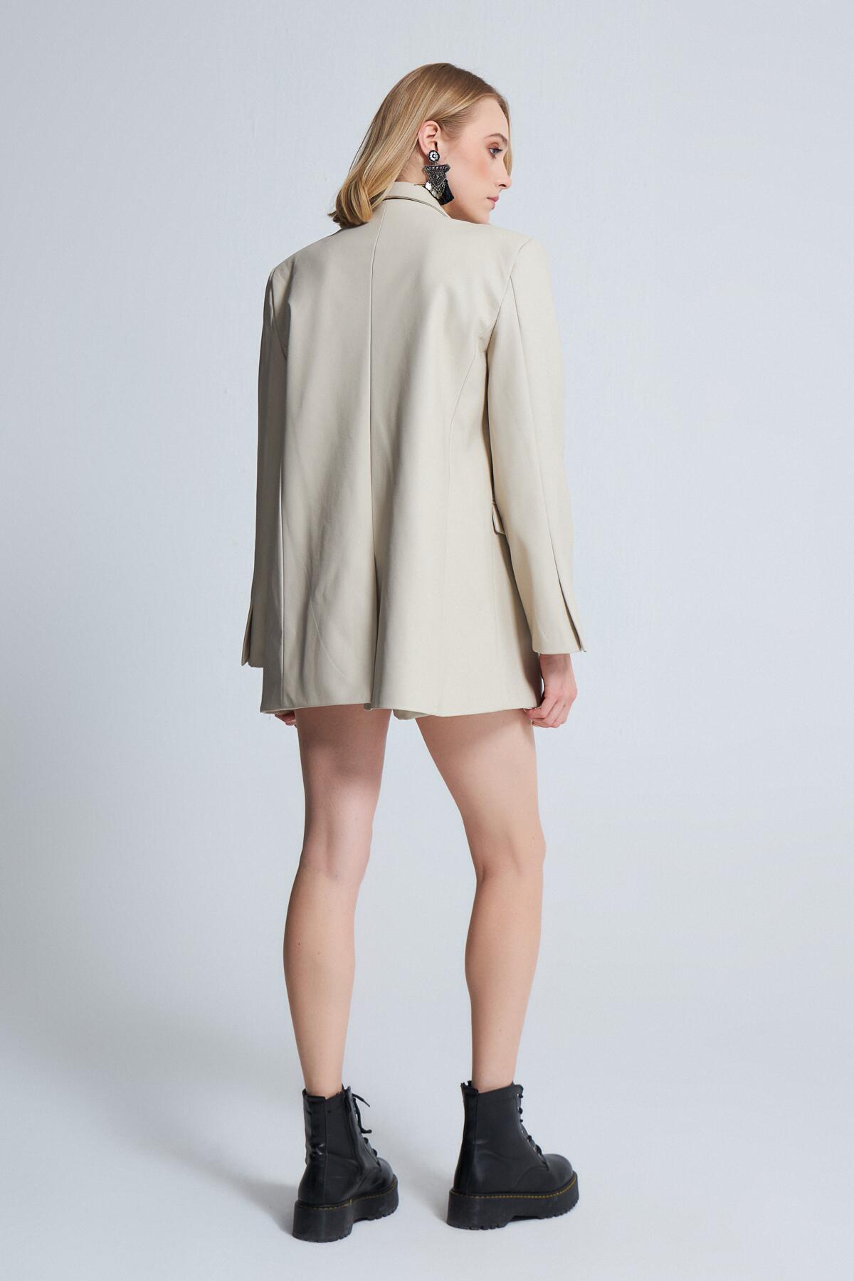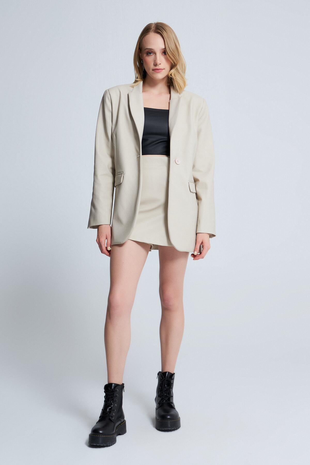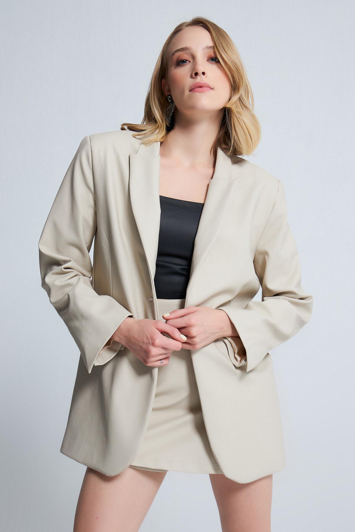 Modellinformationen Höhe: 1,74 Brust: 87 Taille: 64 Hüfte: 90 Produktinformation Stoff: Kunstleder Probengröße: 38 Stoffart: Kunstleder Farbe: Nerz AUFGRUND DER KOMPAKTAUFNAHME KÖNNEN FARBTÖNE ABWEICHEN.