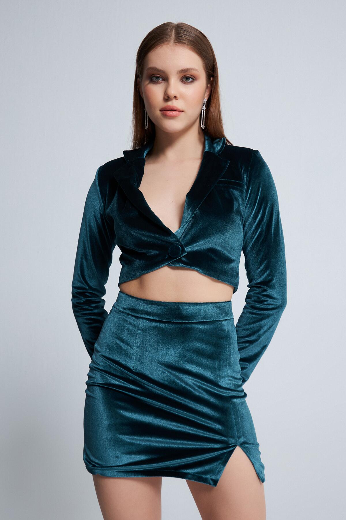 Modellinformationen Höhe: 1,74 Brust: 82 Taille: 62 Hüfte: 88 Produktinformation Stoff : Samt Probengröße: 34 Stoffart: Samt Farbe grün AUFGRUND DER KOMPAKTAUFNAHME KÖNNEN FARBTÖNE ABWEICHEN.