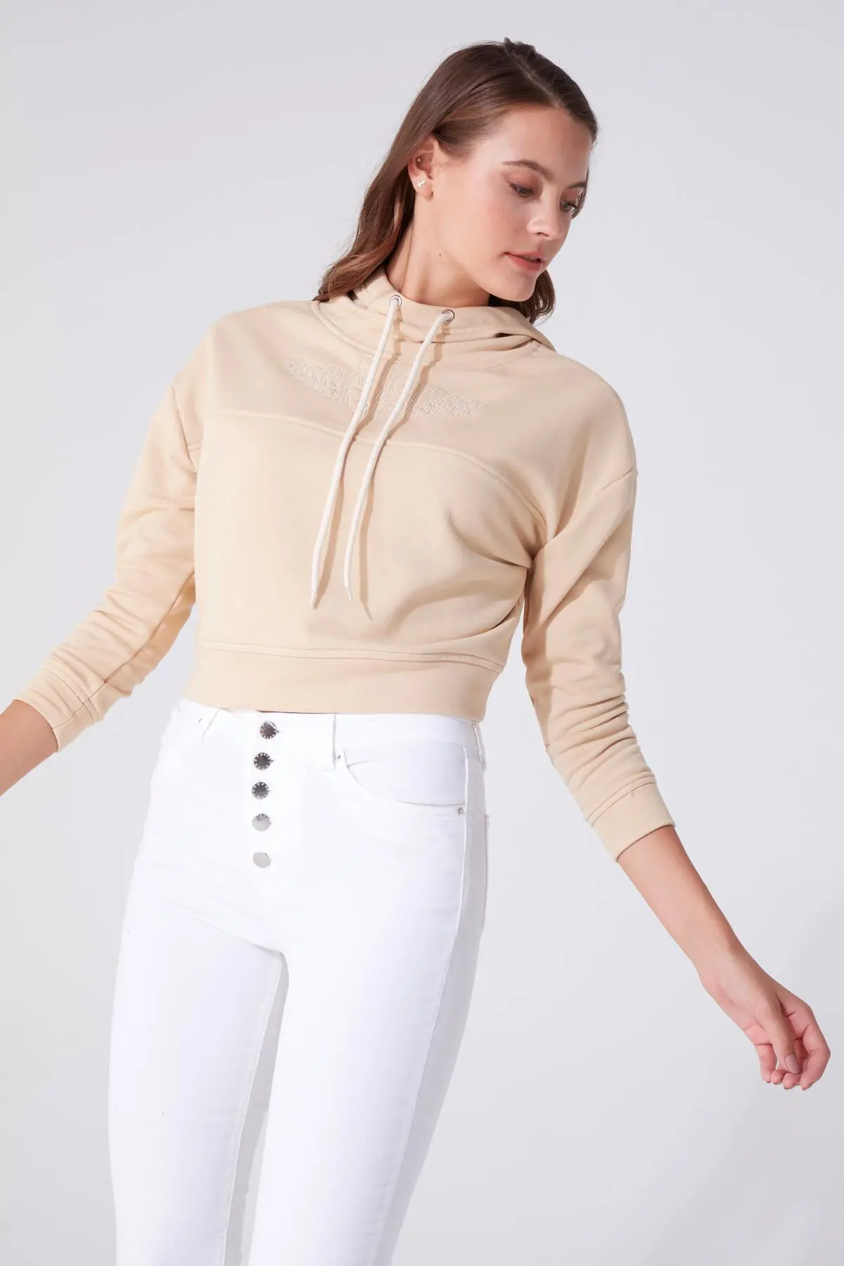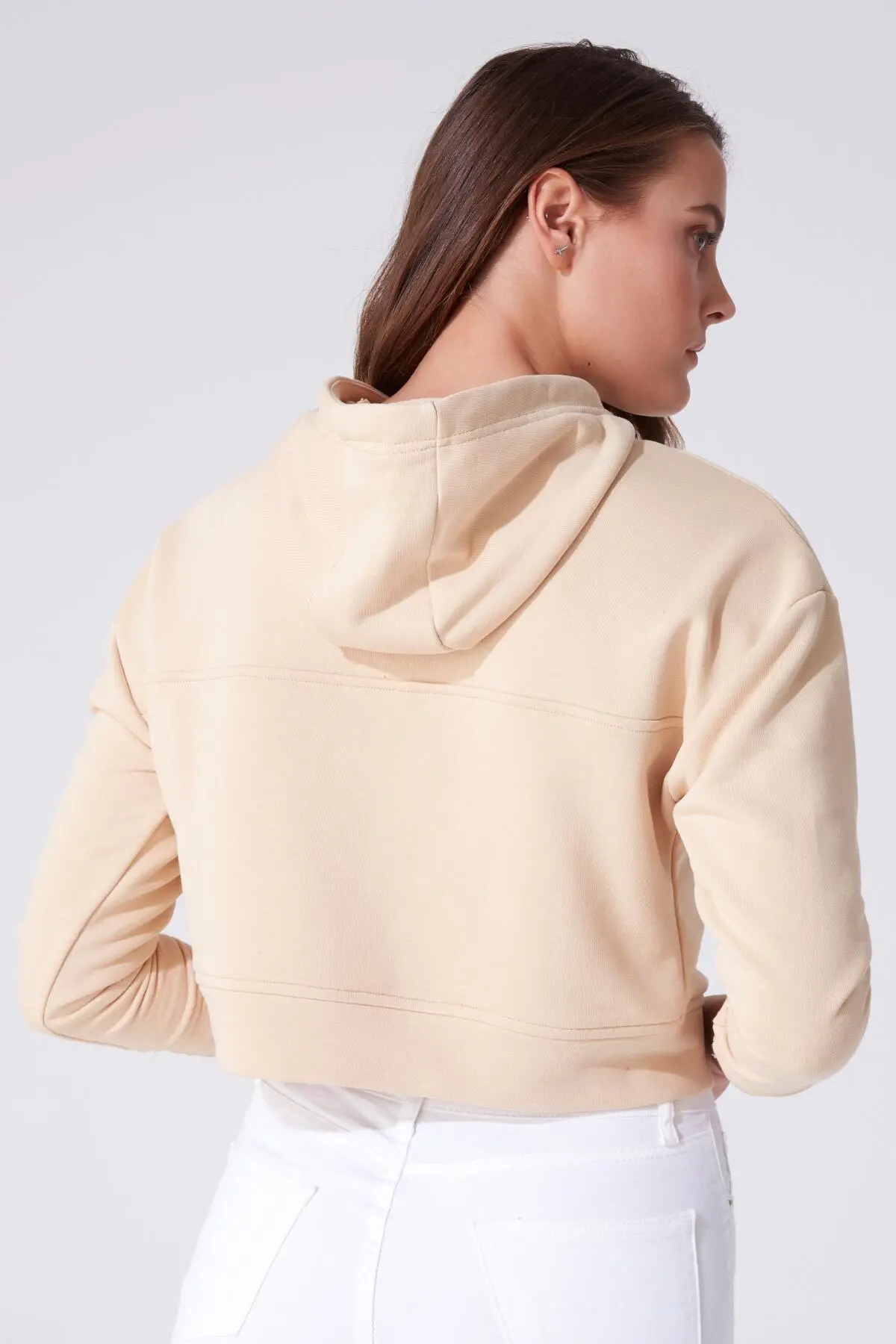 Beigefarbenes kurzes Sweatshirt mit Kapuze