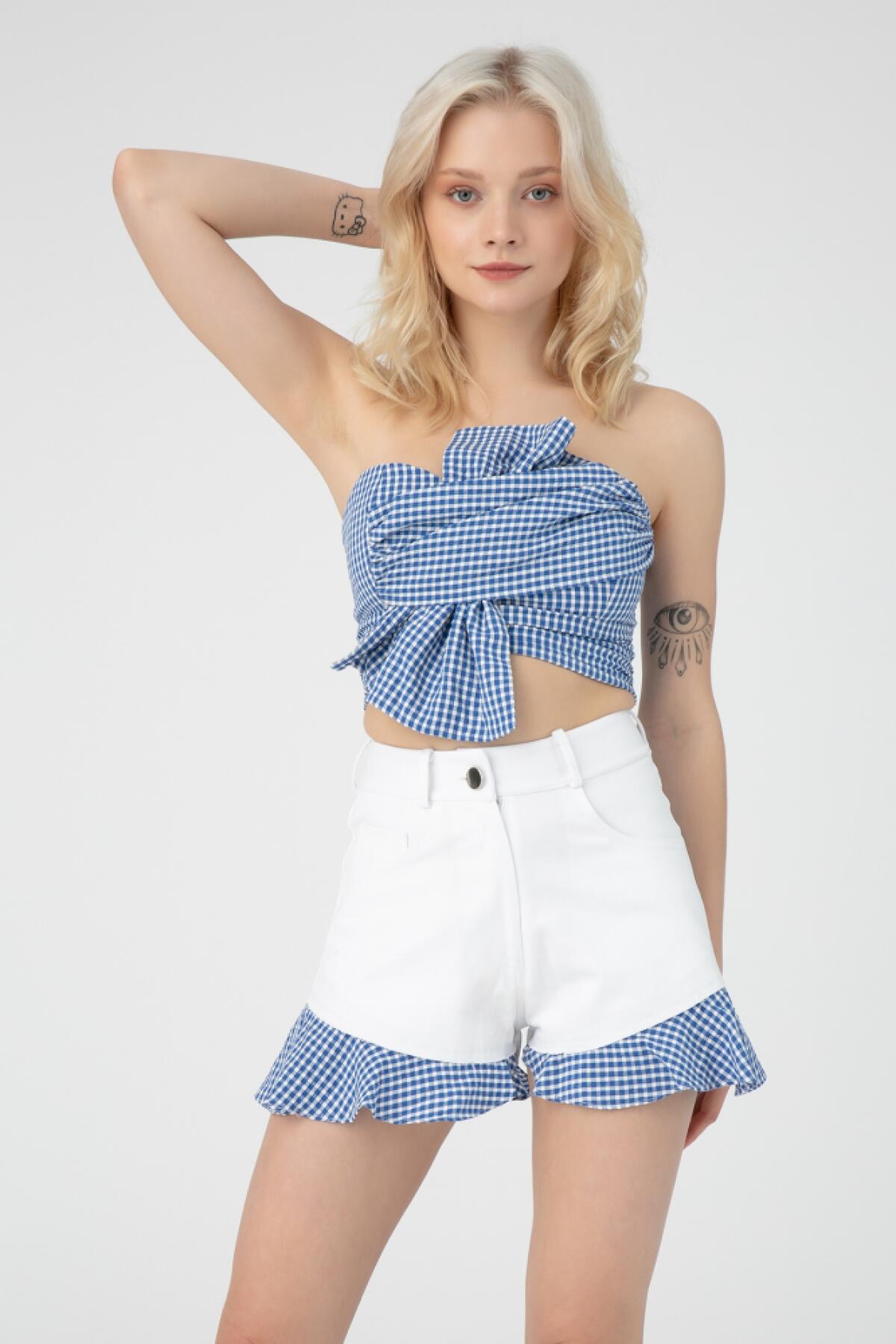 Modellinformationen Höhe: 1,71 Brust: 82 Taille: 58 Hüfte: 88 Produktinformation Stoff : Gingham Probengröße: 32 Stoffart : Gingham Farbe blau AUFGRUND DER KOMPAKTAUFNAHME KÖNNEN FARBTÖNE ABWEICHEN.