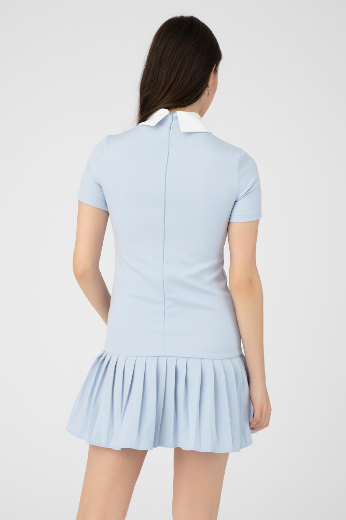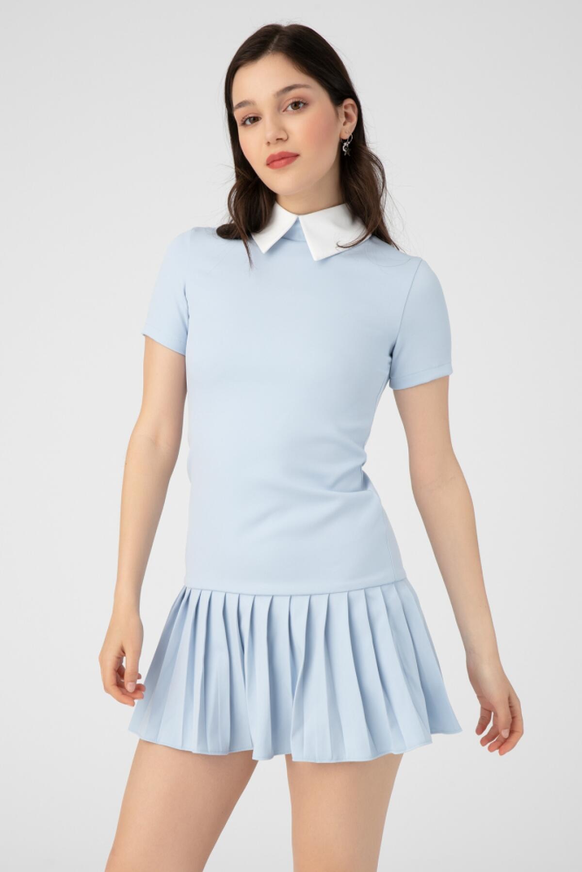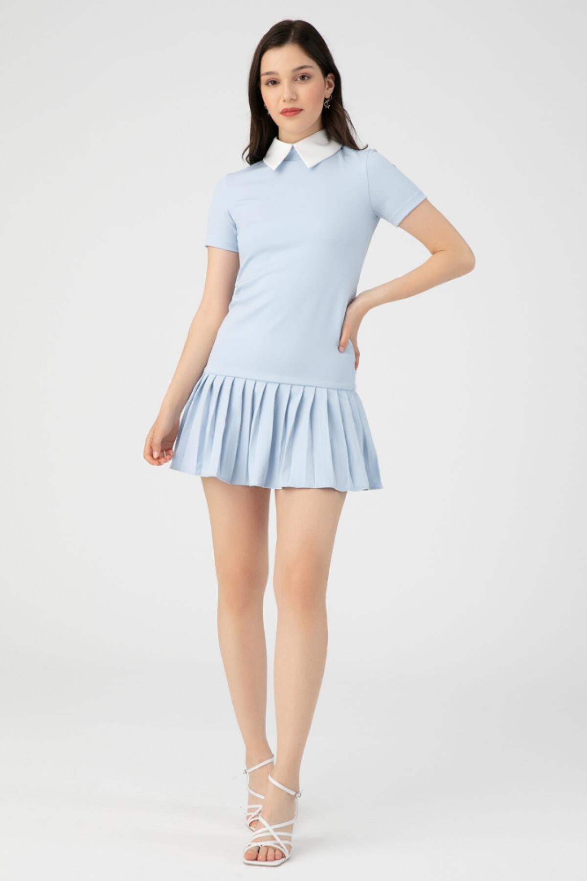 Blaues Kleid mit plissiertem Rockteil und weißem Kragen
