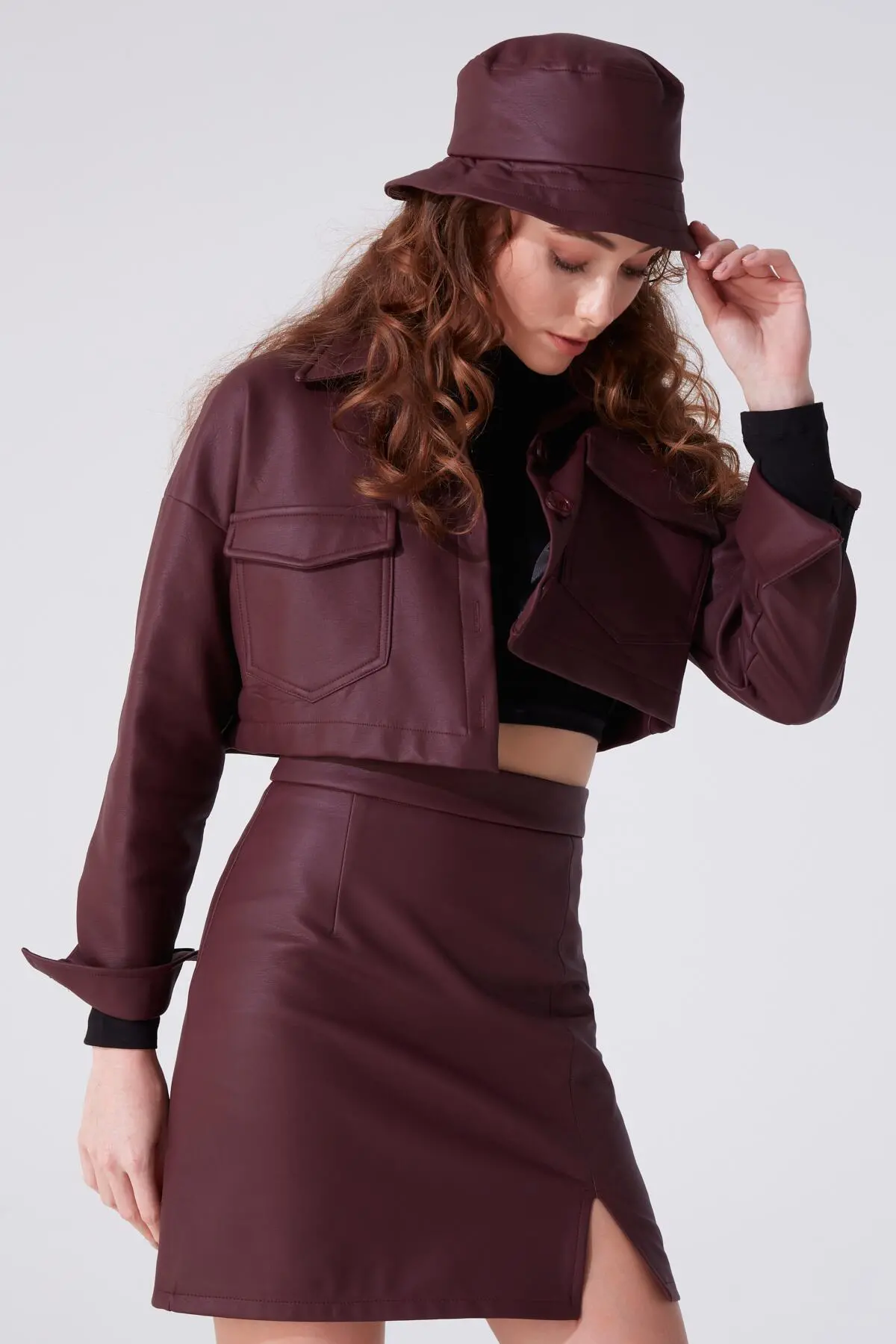 Modellinformationen Höhe: 1,73 Brust: 83 Taille: 60 Hüfte: 89 Produktinformation Stoff : Leder Probengröße: 34 Farbe : Burgund AUFGRUND DER KOMPAKTAUFNAHME KÖNNEN FARBTÖNE ABWEICHEN.