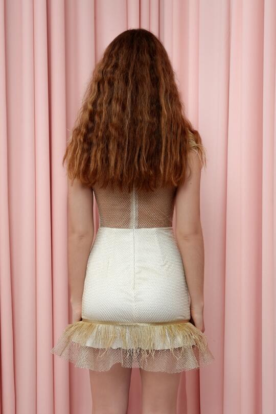 Modellinformationen Höhe: 1,75 Brust: 81 Taille: 64 Hüfte: 91 Produktinformation Stoff: Mesh Probengröße: 34 Gewebeart: Mesh Farbe: Gold AUFGRUND DER KOMPAKTAUFNAHME KÖNNEN FARBTÖNE ABWEICHEN.