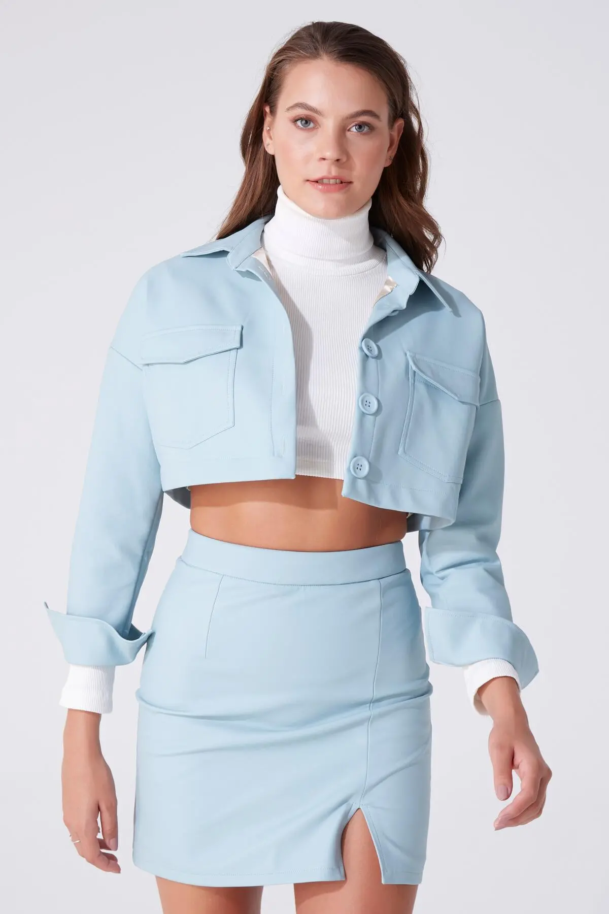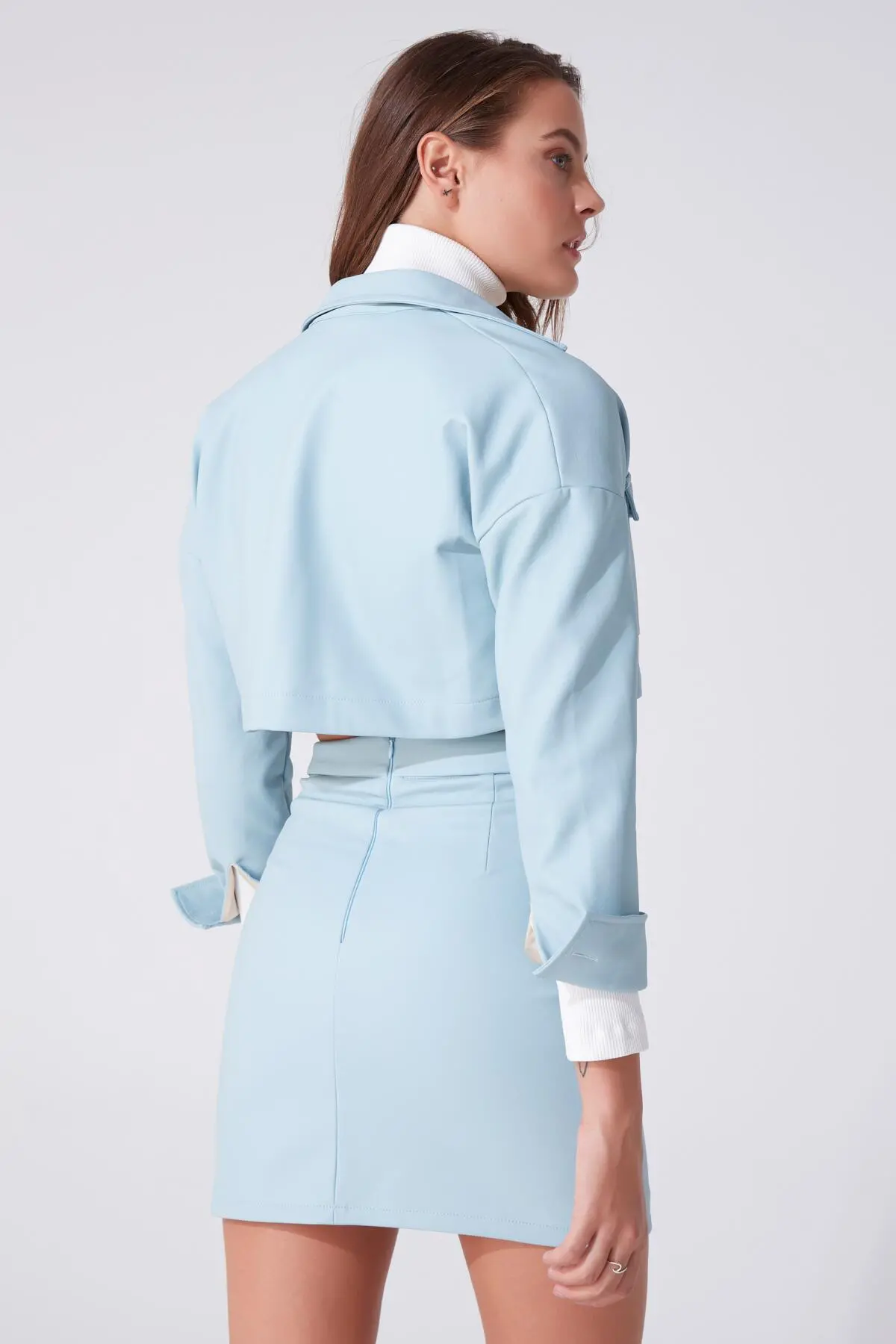 Modellinformationen Höhe: 1,79 Brust: 83 Taille: 61 Hüfte: 89 Produktinformation Stoff : Leder Probengröße: 36 Farbe blau AUFGRUND DER KOMPAKTAUFNAHME KÖNNEN FARBTÖNE ABWEICHEN.