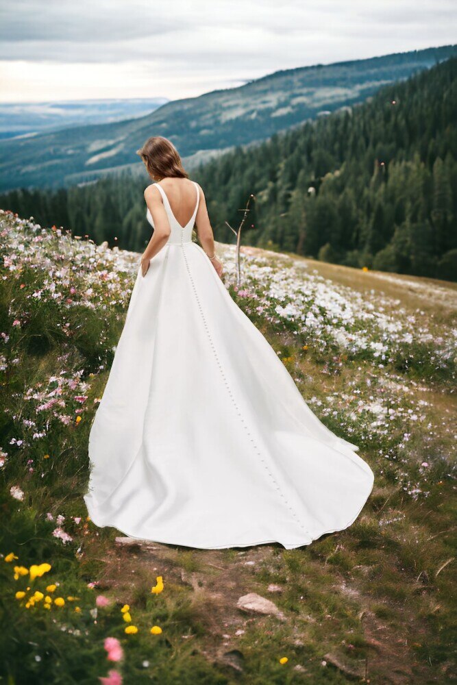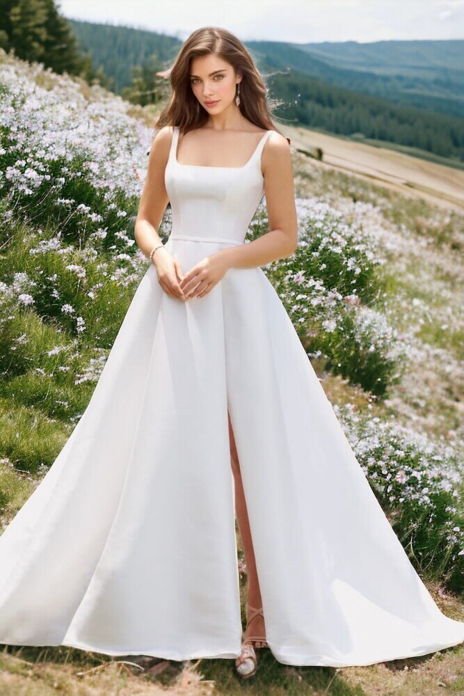KIRIK BEYAZ ASKILI YIRTMAÇLI GENİŞ ETEKLİ GELİNLİK
