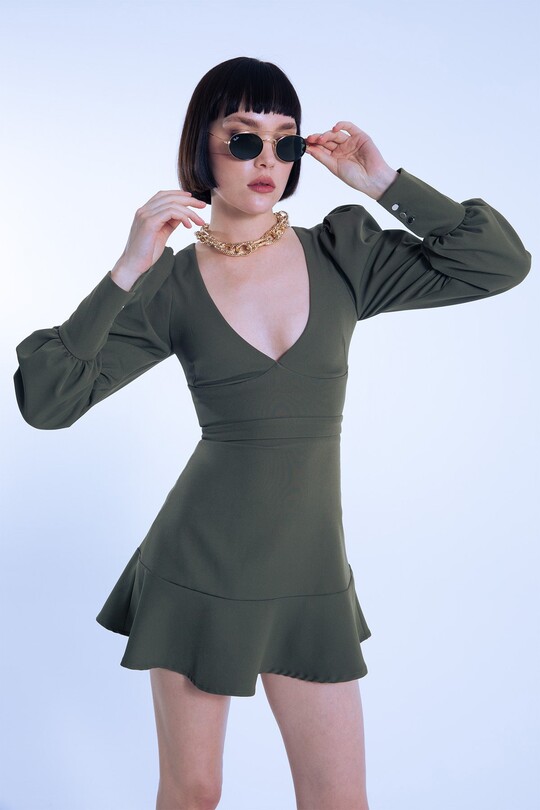 "Kurzes Kleid mit V-Ausschnitt, Ballonärmeln und olivgrünem Volant am Saum