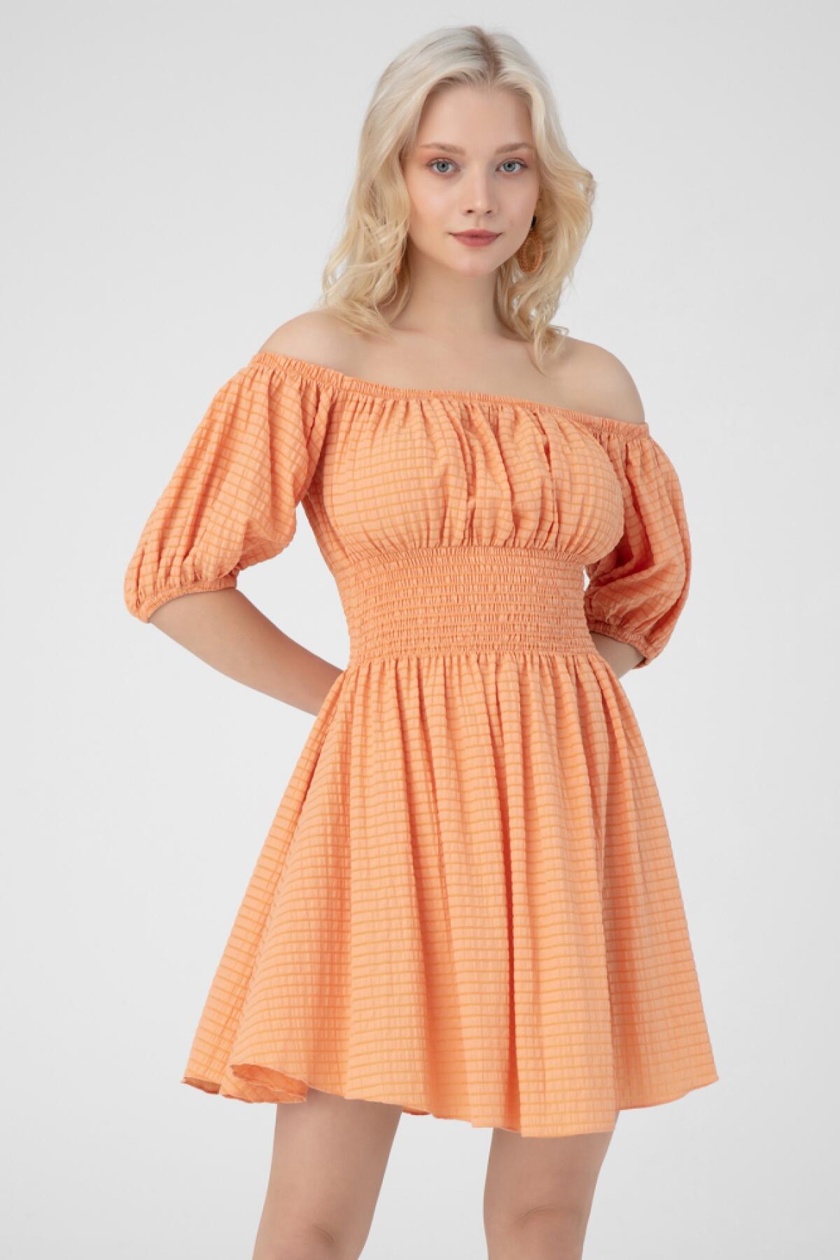 Orangenfarbenes Kleid mit überschnittenen Schultern und elastischem Bund