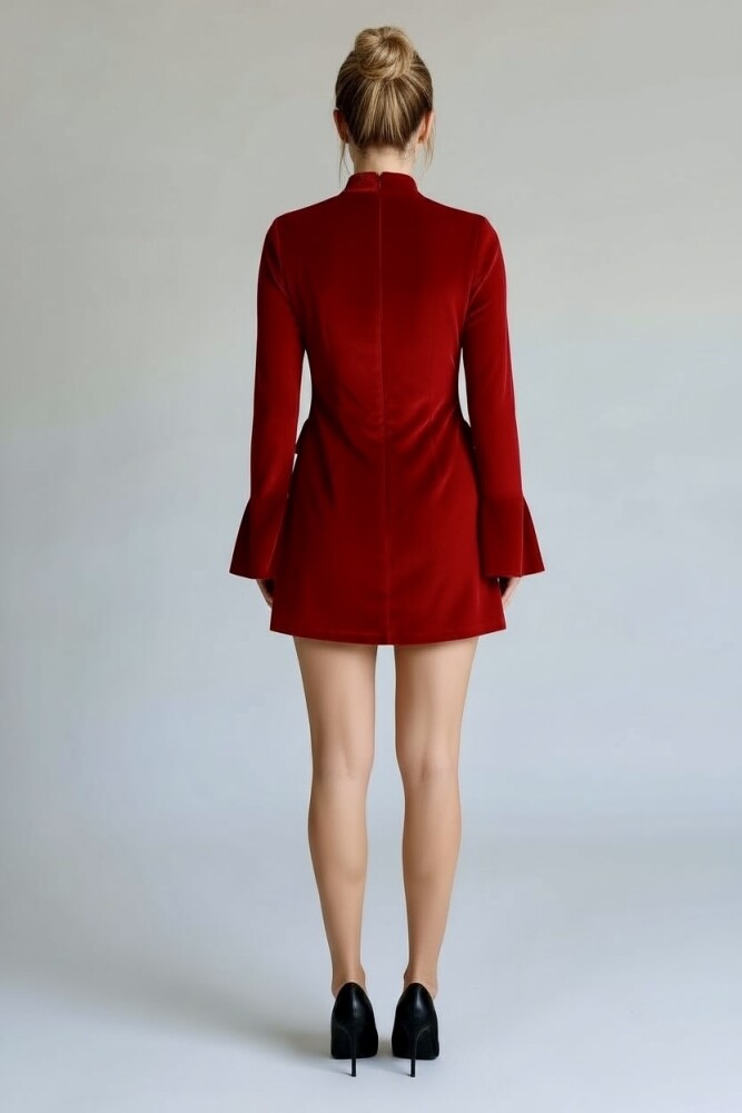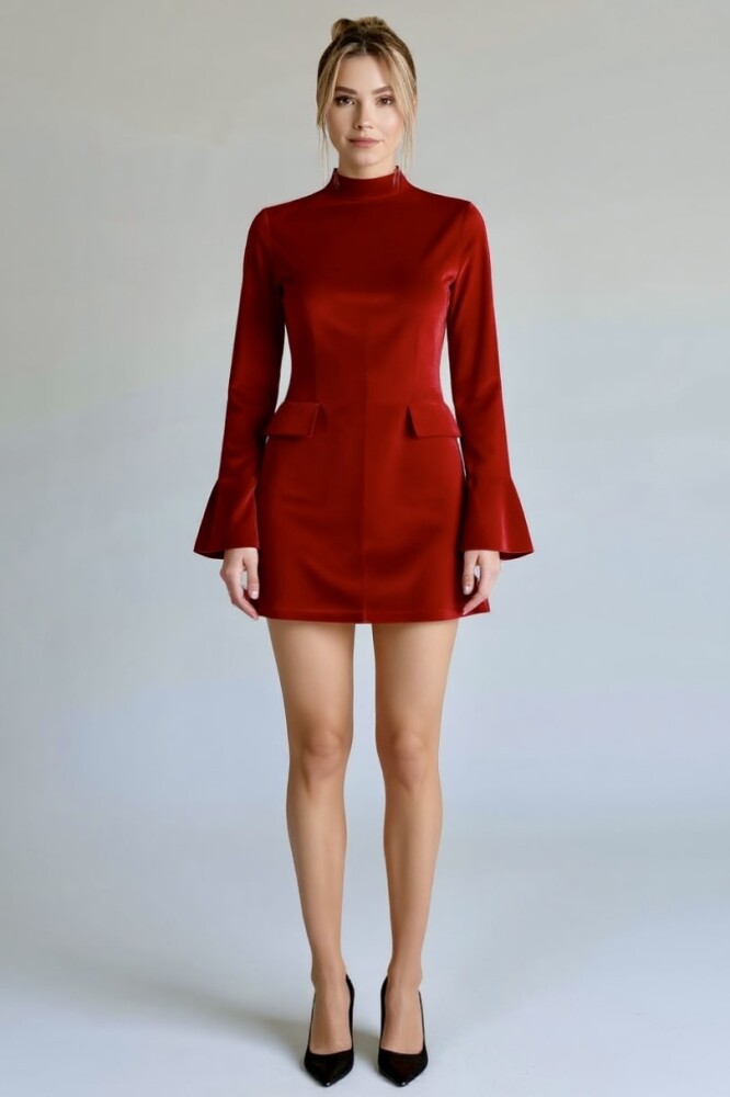 The RED LONG-SLEEVED VELVET DRESS WITH POCKET DETAILS combines elegance and comfort. Made from soft velvet fabric, it fits the body perfectly and features functional pockets that add both style and practicality. Ideal for special occasions and evening outings.