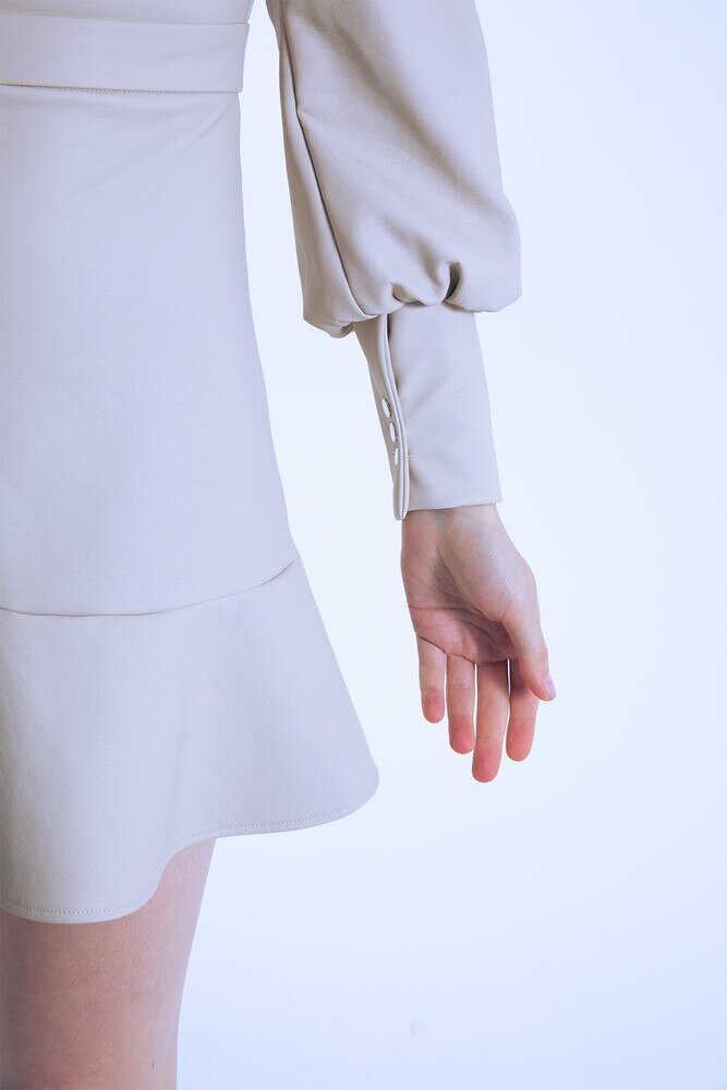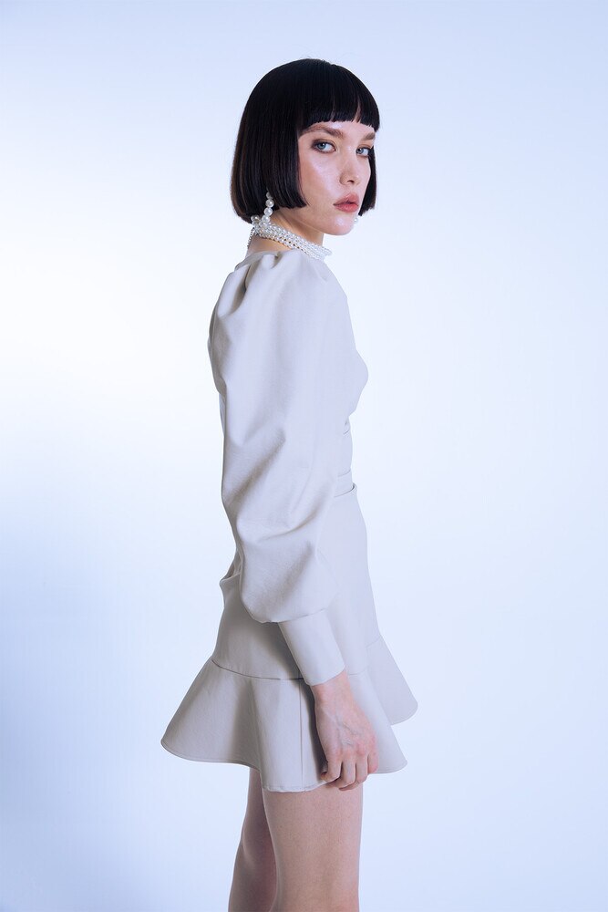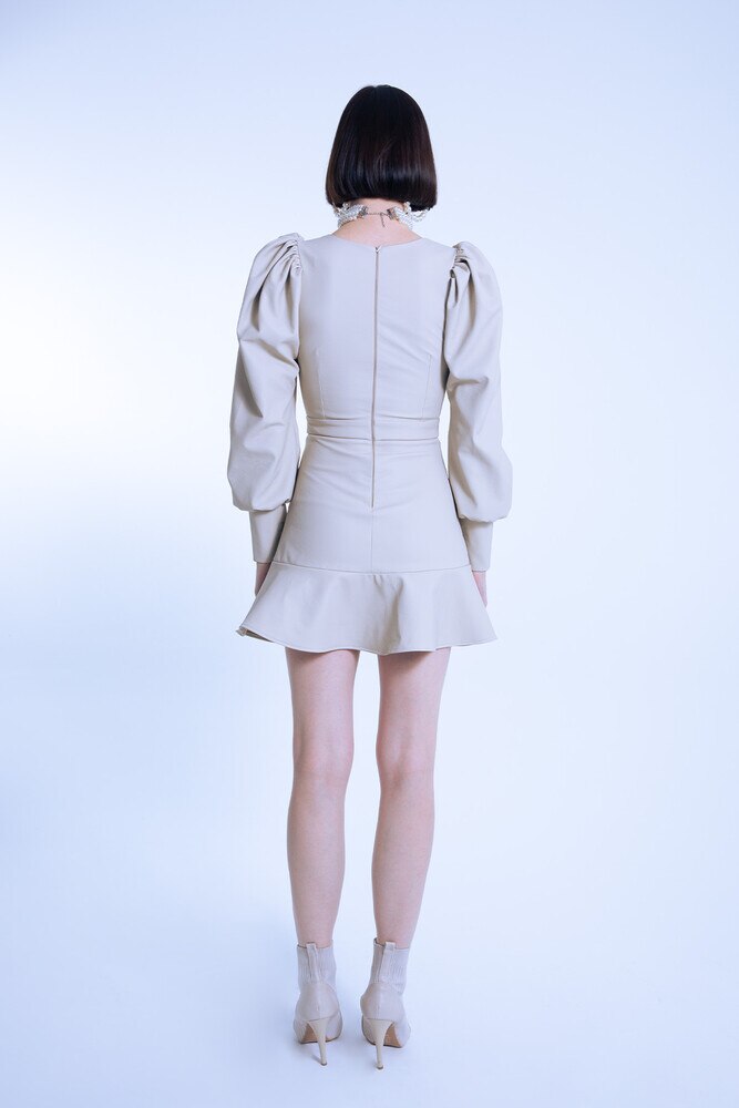 Schickes kurzes Lederkleid in Taupe mit V-Ausschnitt, Puffärmeln und Rüschenabschluss