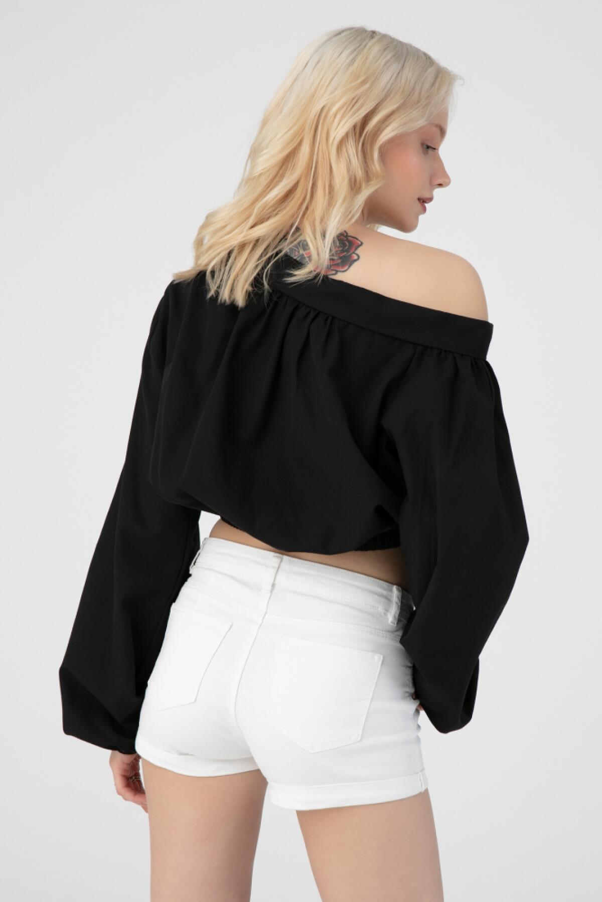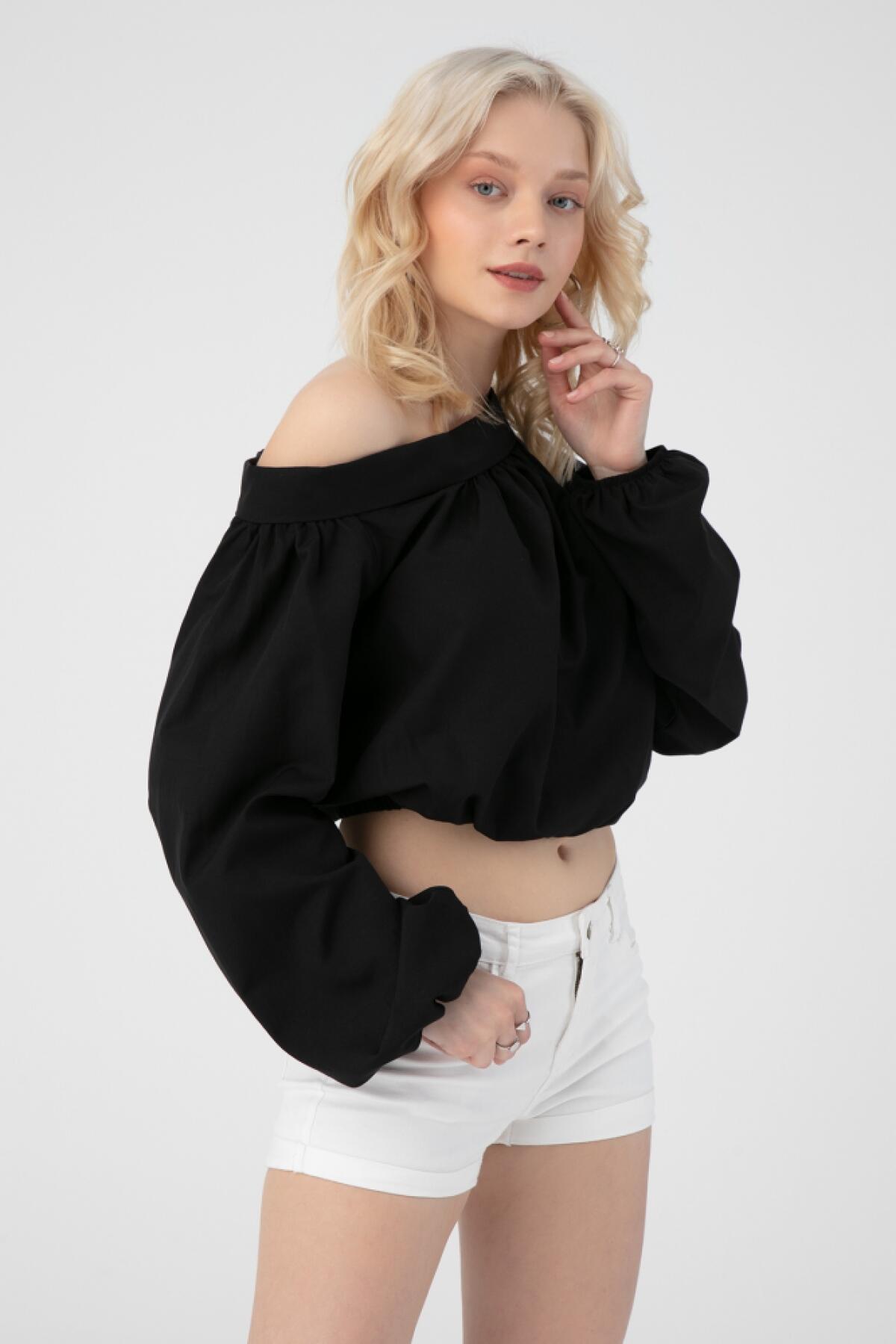 Schwarze Bluse mit überschnittenen Schultern und elastischem Bund