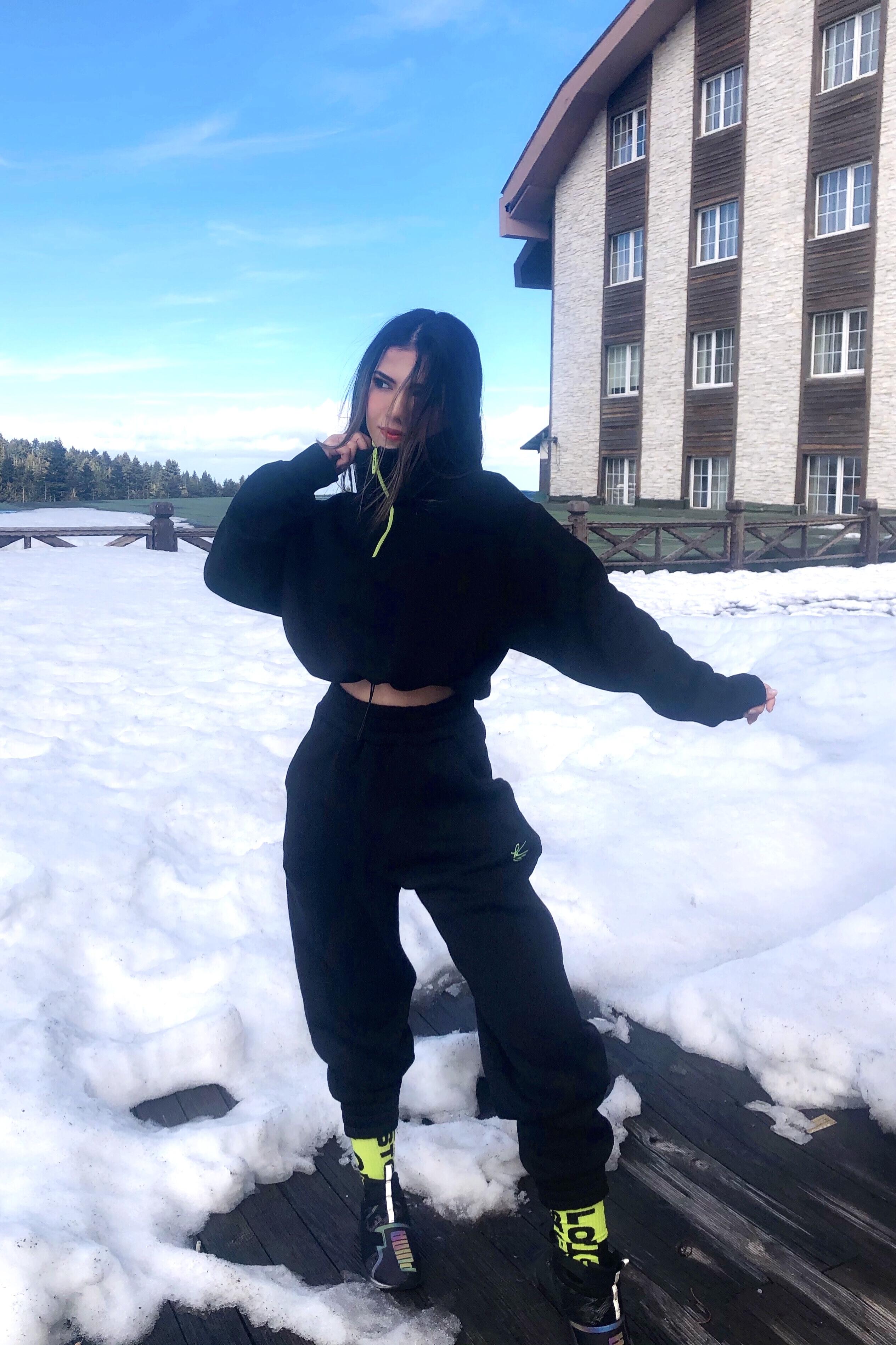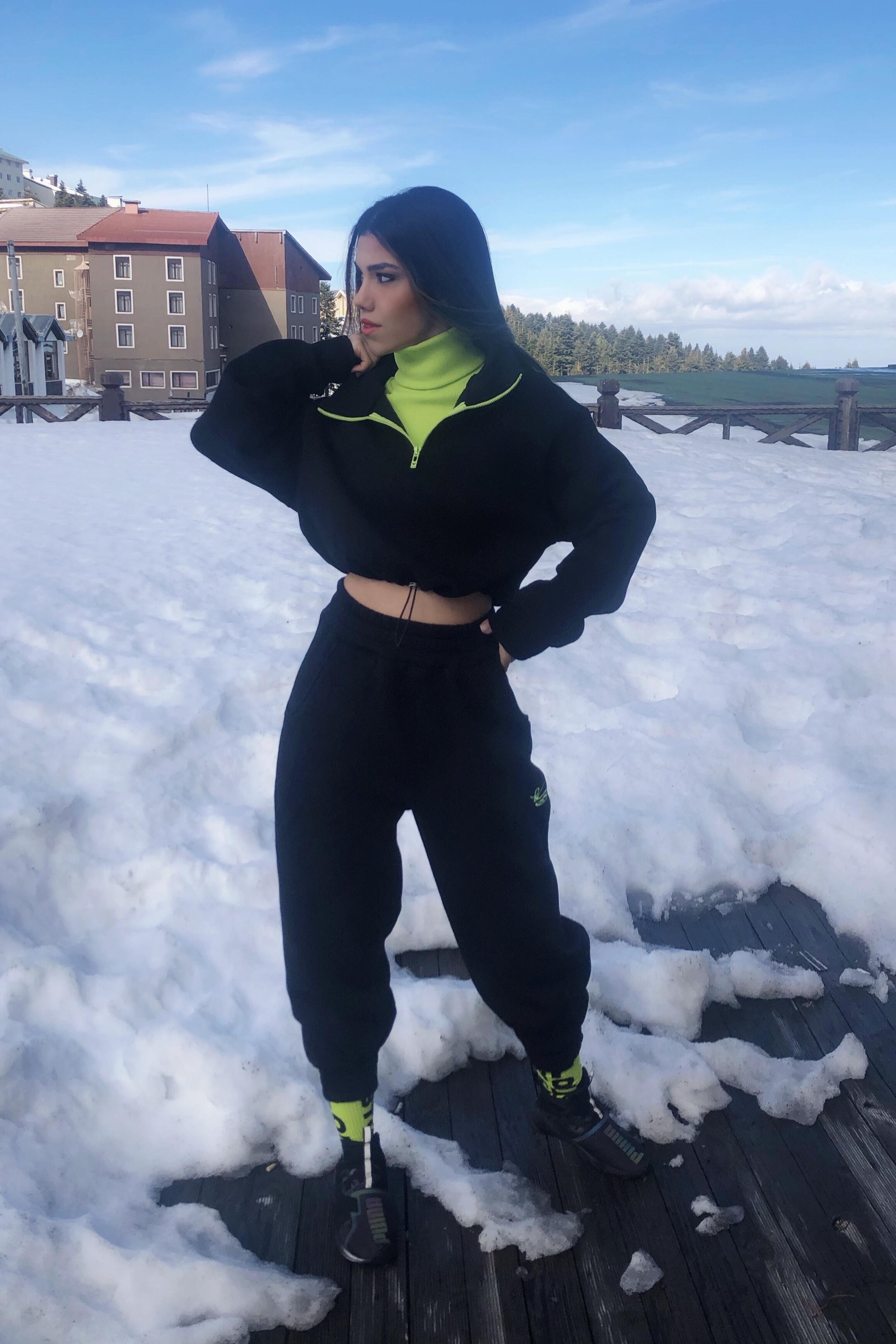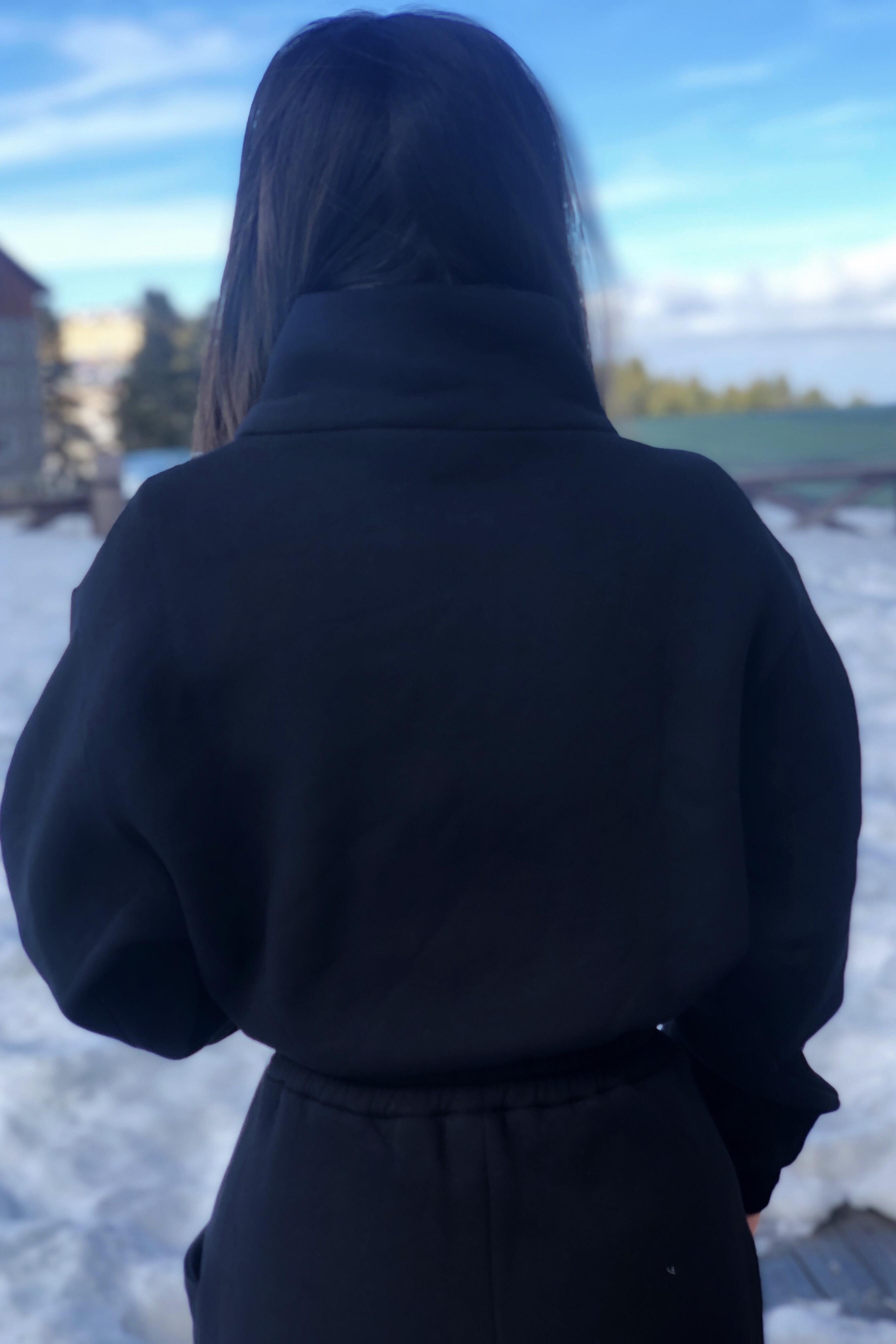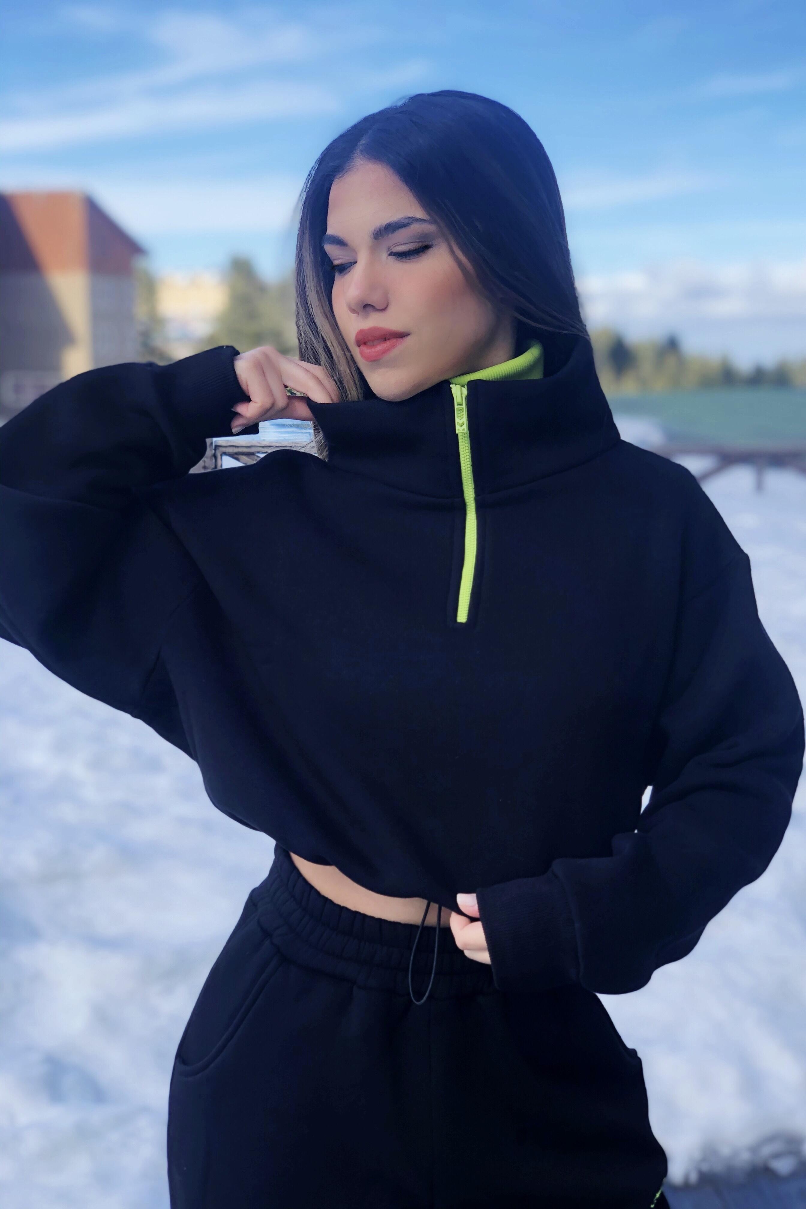 Schwarzer kurzer Sweat mit elastischem Bund und Frontreißverschluss