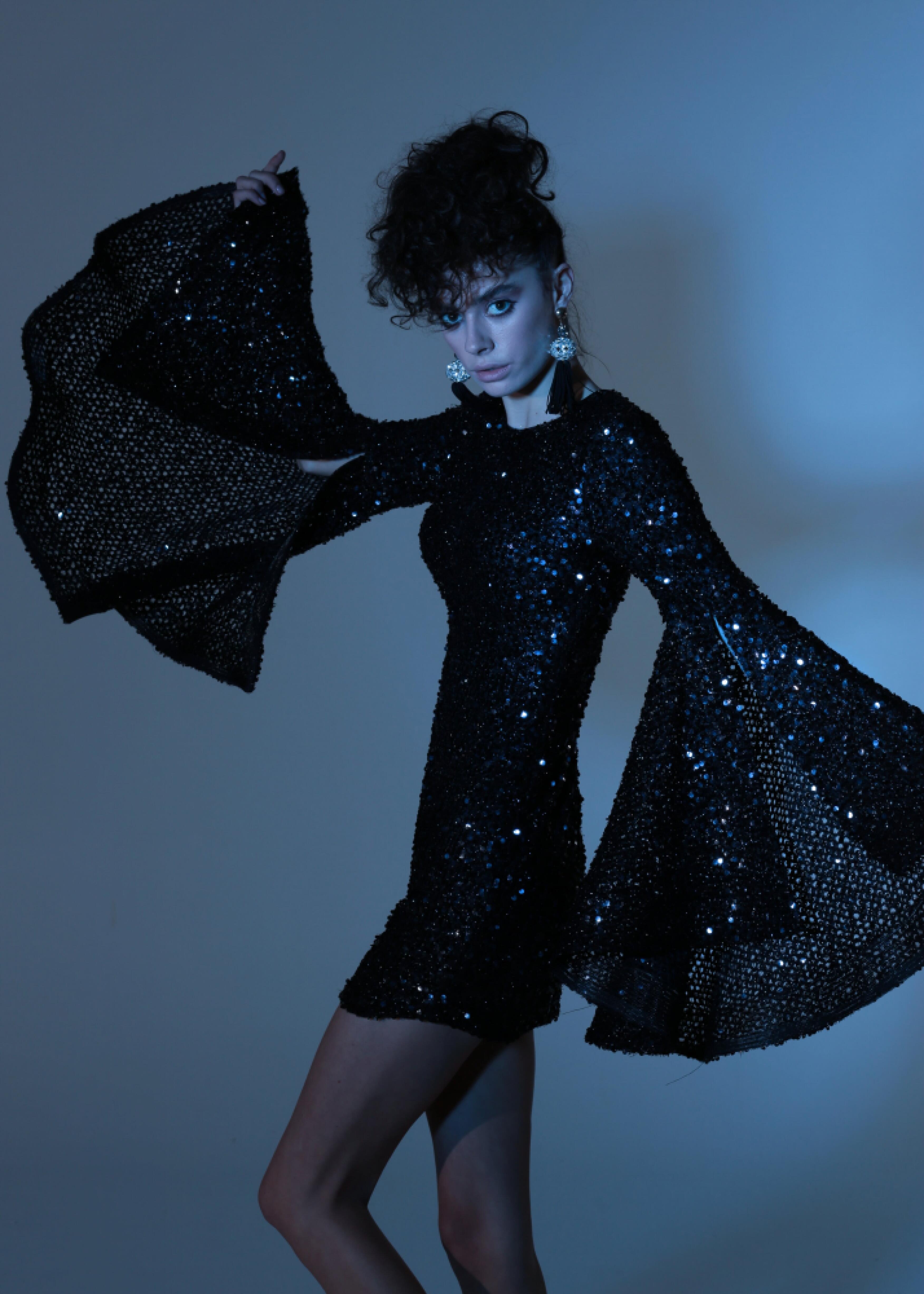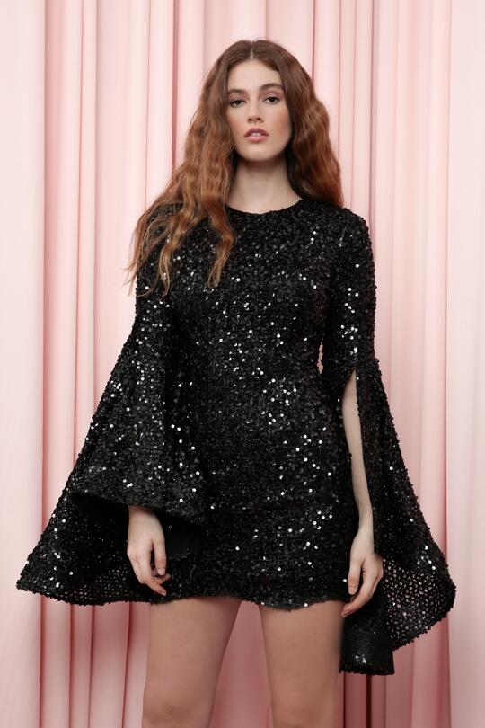 SCHWARZES KLEID MIT OFFENEN ÄRMELN, SCHLITZ UND FIGURBETONTEM SCHNITT