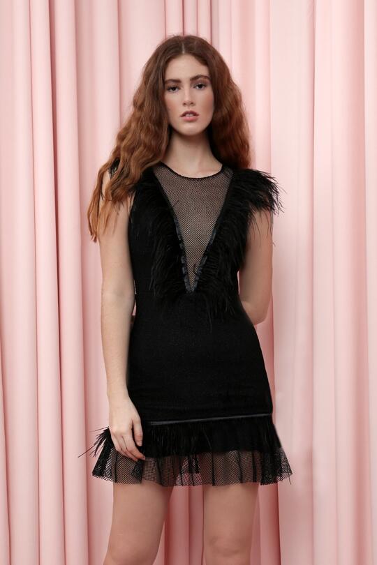 SCHWARZES KURZES KLEID MIT FEDERN AM BRUSTBEREICH, VOLANT-AM SAUM UND NETZDETAILS