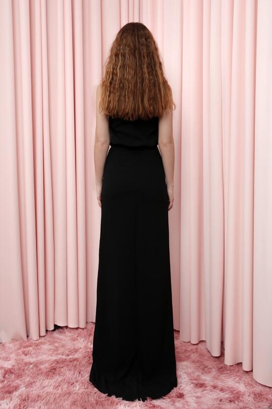 SCHWARZES LANGES TRÄGERLOSES ABENDKLEID AUS EINFARBIGEM STOFF MIT GERAFFTER TAILLE