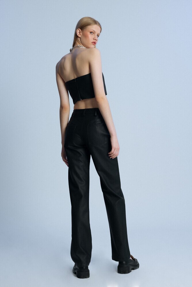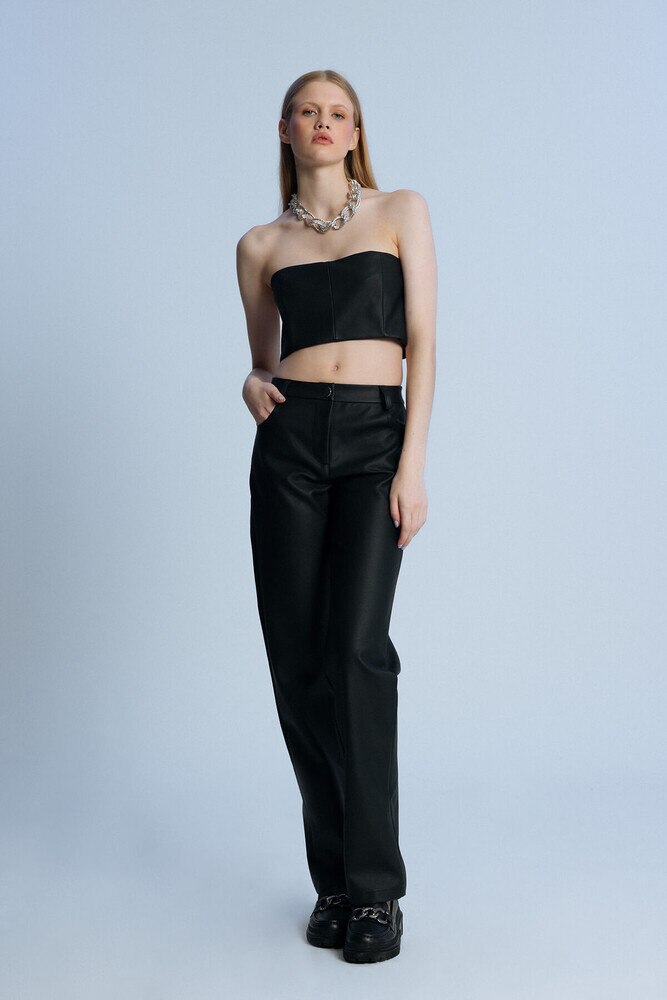 SCHWARZES TRÄGERLOSES KURZES LEDER-BUSTIER