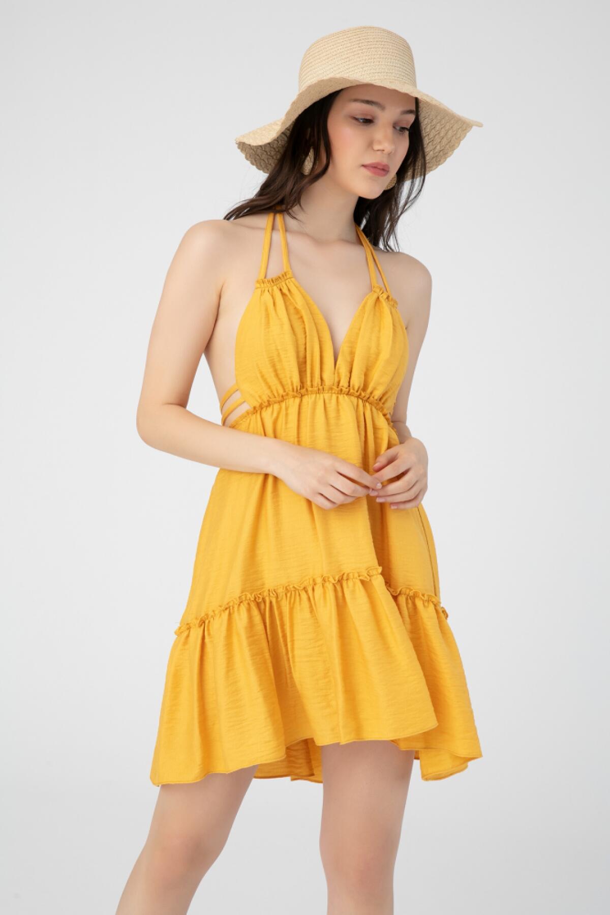 Senffarbenes Leinenkleid mit gebundenem Hals und Brustdetails