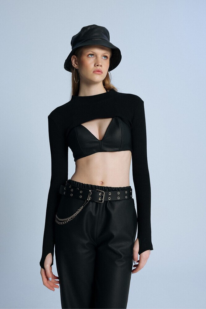 SİYAH KUŞGÖZLÜ VE ZİNCİR DETAYLI DERİ KEMER.