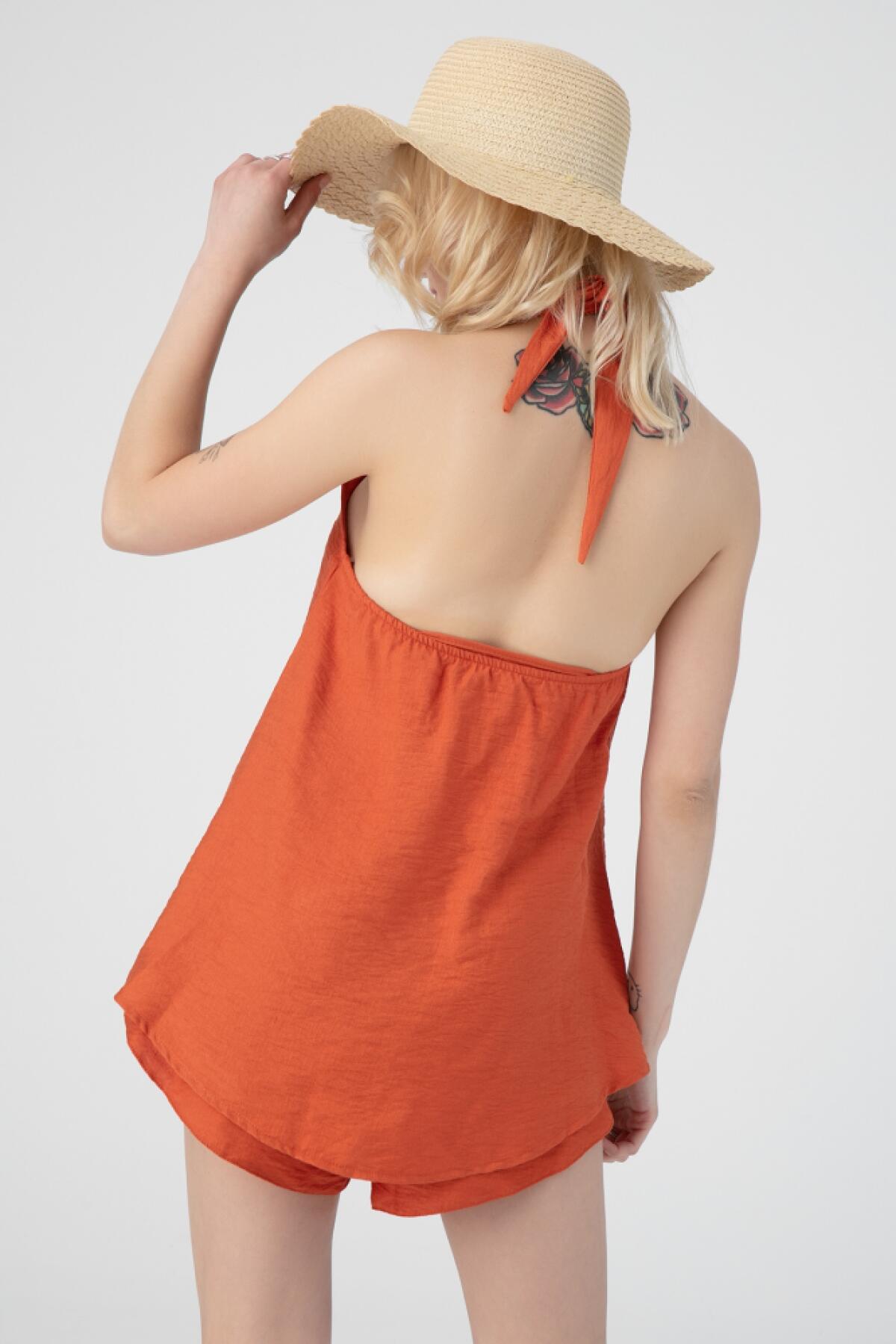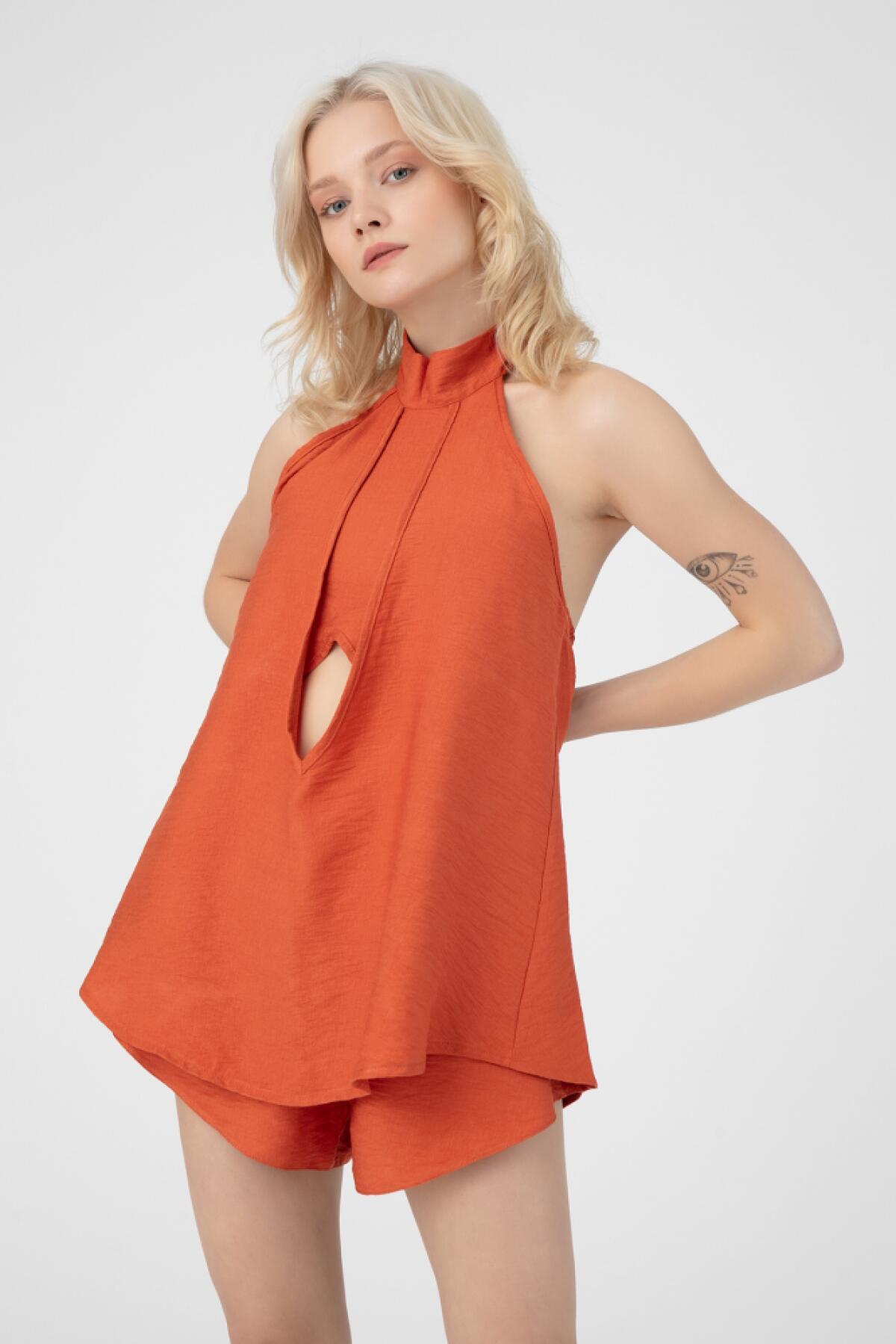 Terrakottafarbene Leinenbluse zum Binden im Nacken