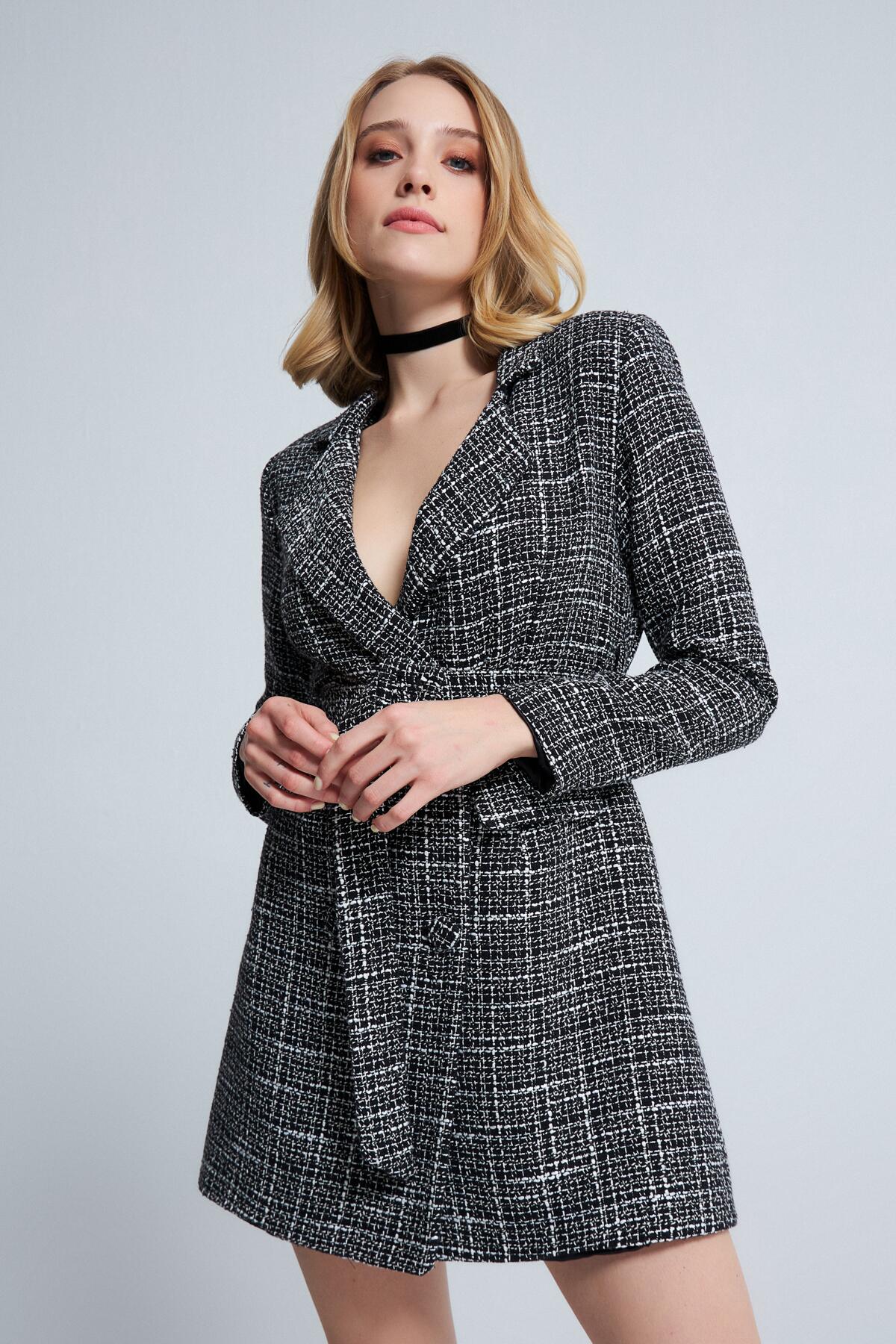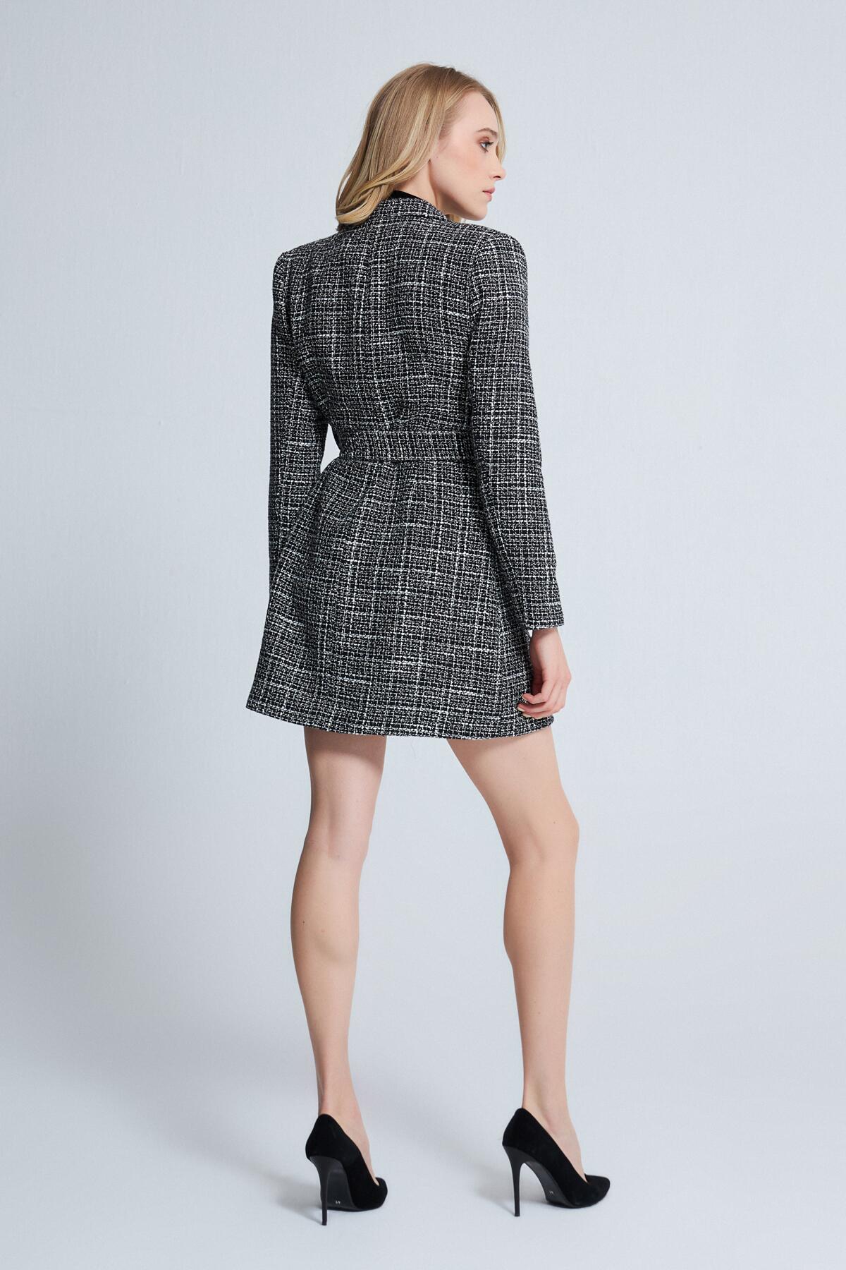 TUVITES KLEID SCHWARZ/WEISS MIT GEPOLSTERTER SCHULTER UND GÜRTELTER Taille