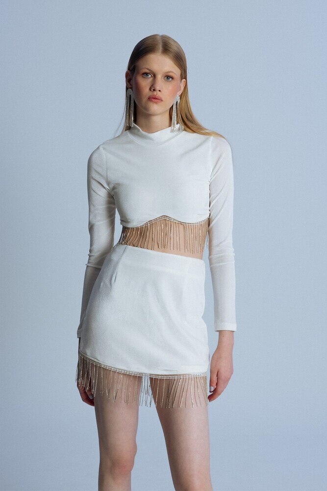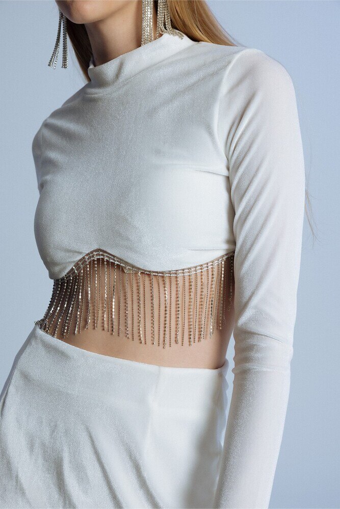 WEIßE LANGÄRMLIGE HOT-STONE-BLUSE AUS SAMT