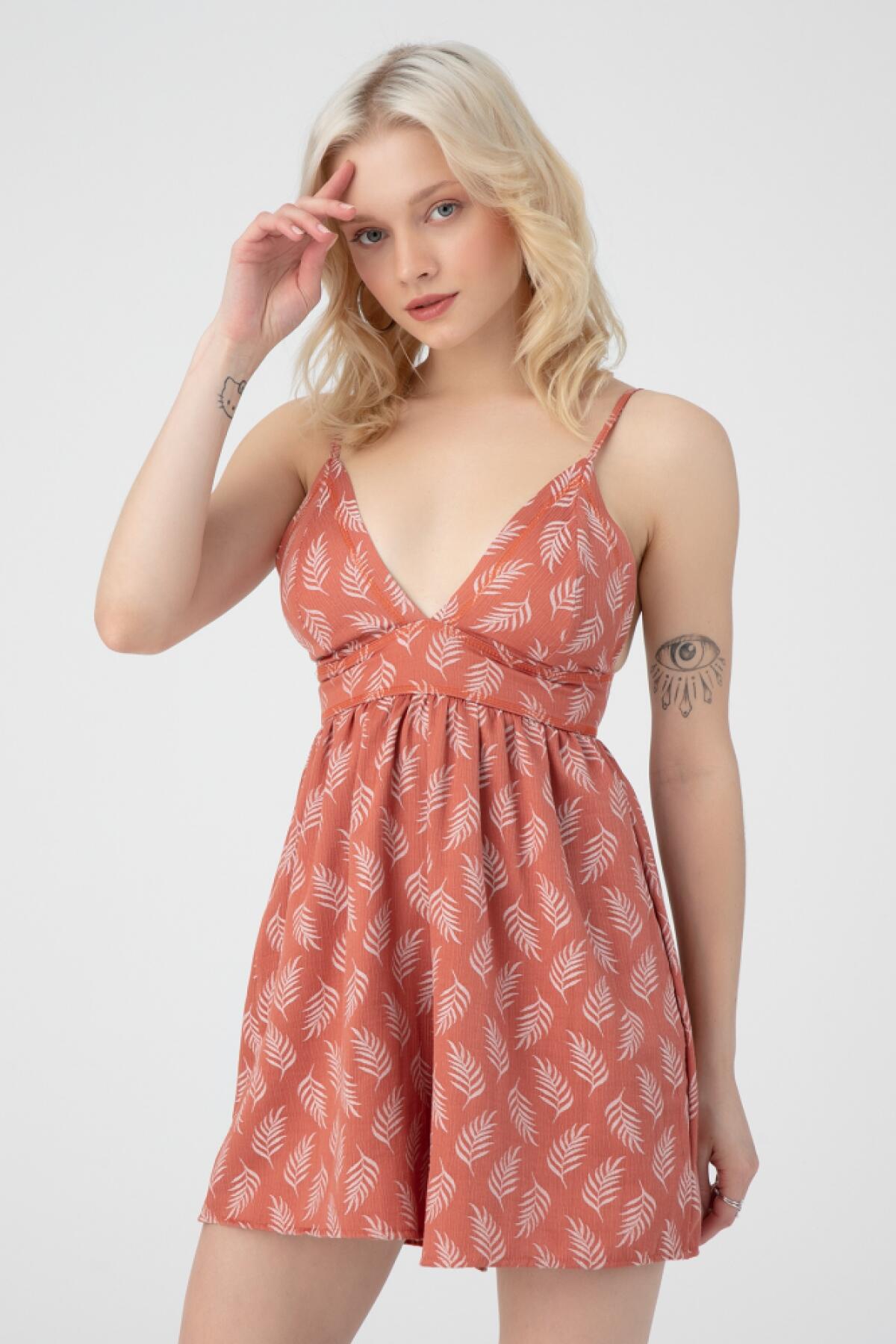Ziegelroter Jumpsuit mit Triangel-Oberteil und Shorts